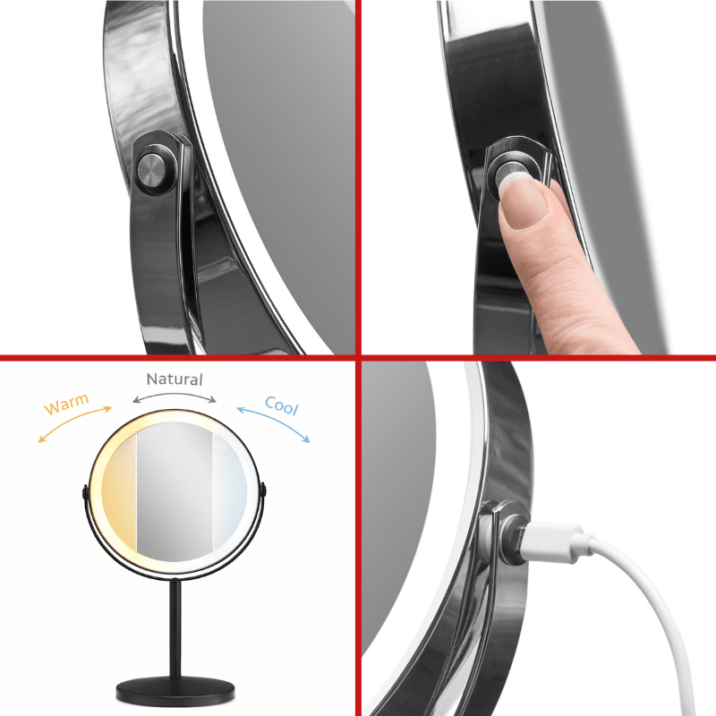 Miroir de table LED rechargeable avec une lumière LED intégrée puissante, réglable en trois teintes différentes: chaude, neutre et froide. Grâce à un bouton tactile discret sur le côté, vous contrôlez facilement l'allumage/extinction, le choix de la couleur lumineuse et l'ajustement de la luminosité avec la fonction de gradation intégrée.