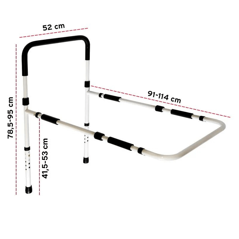 Barrière de lit stable avec support au sol, facilitant l'entrée et la sortie du lit. Elle offre soutien et sécurité autour du lit, empêchant l'utilisateur de tomber. Le cadre est ajustable et peut être placé n'importe où sous le matelas.