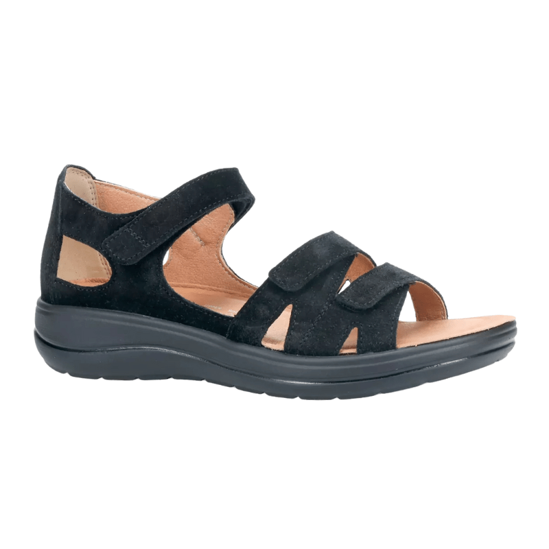 Sort Hartjes damesandal i blødt ruskind og med tre justerbare velcroremme, som sikrer optimal pasform uden tryk.