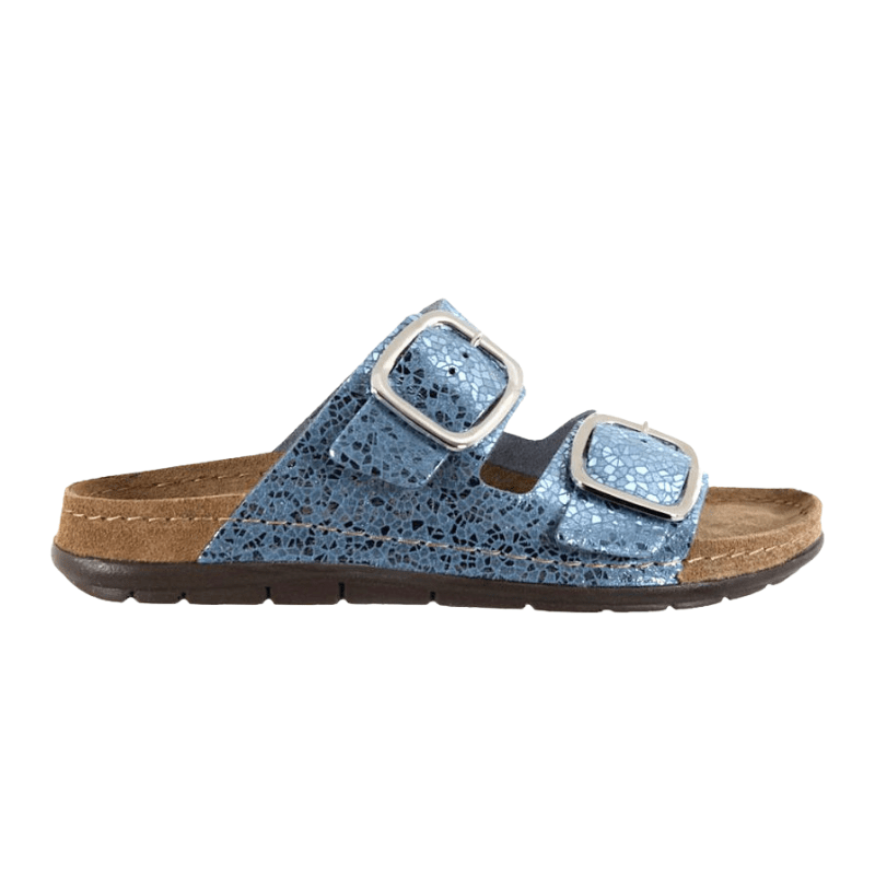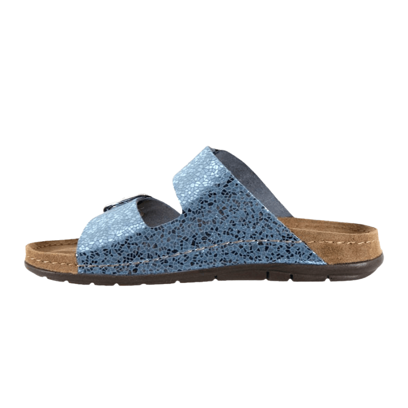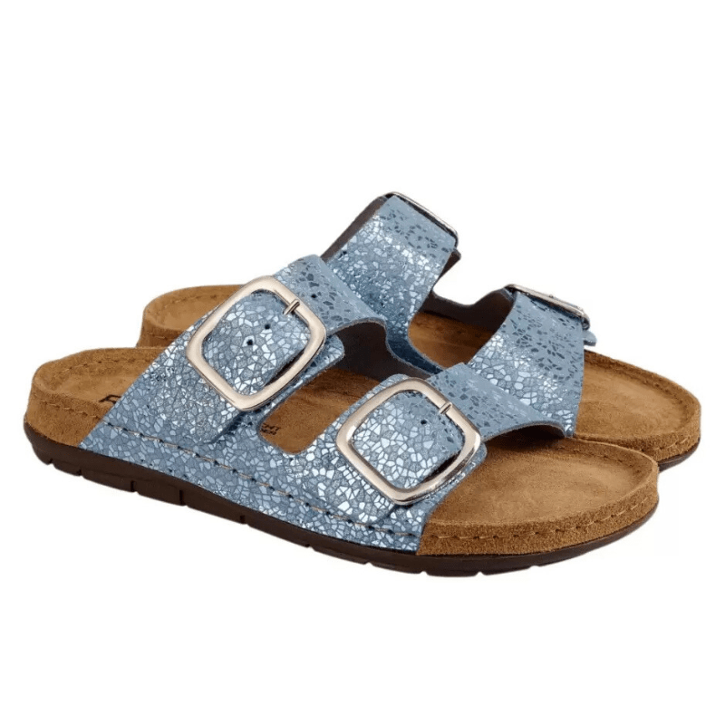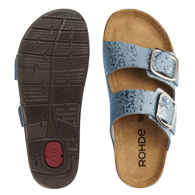 Komfortabel og funklende flot damesandal fra Rohde – perfekt til både hverdag og fest. Sandalen er lavet i skind med et blåt, skinnende mønster og har to justerbare remme, som sikrer en god og individuel pasform.