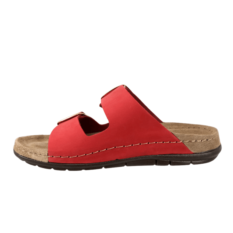 Elegant damesandal i rød nubuck fra Rohde med justerbare remme, der sikrer en individuel pasform.
