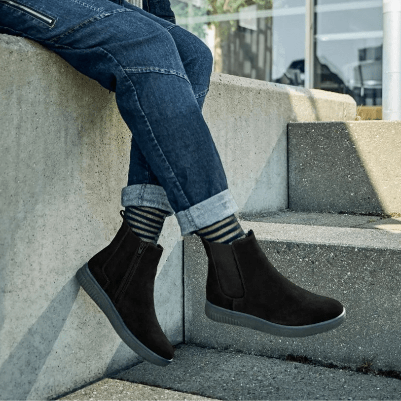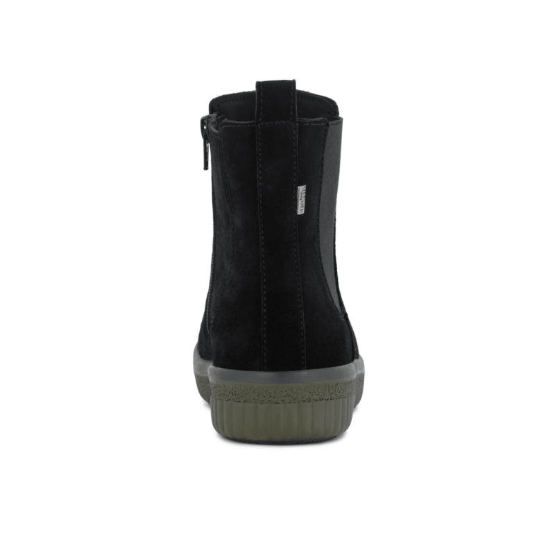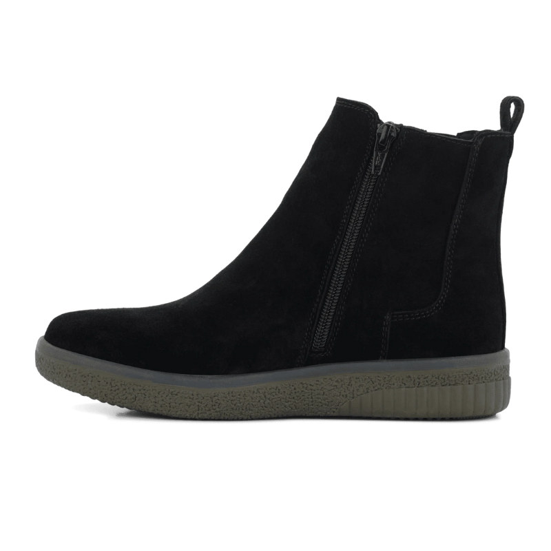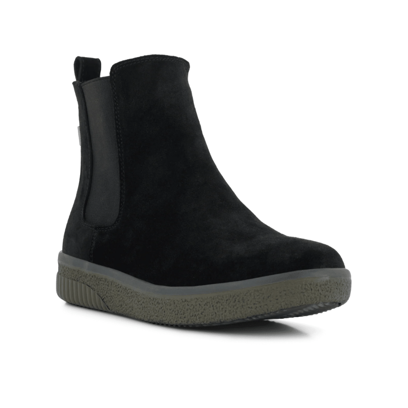 Botte féminine et pratique de Green Comfort en daim noir avec des détails en cuir. La botte est doublée de laine douce et dispose d'une membrane Rain-tex imperméable qui garde les pieds chauds et secs quels que soient les caprices du temps.