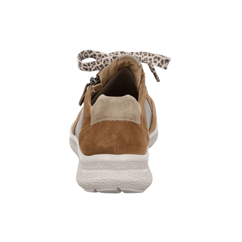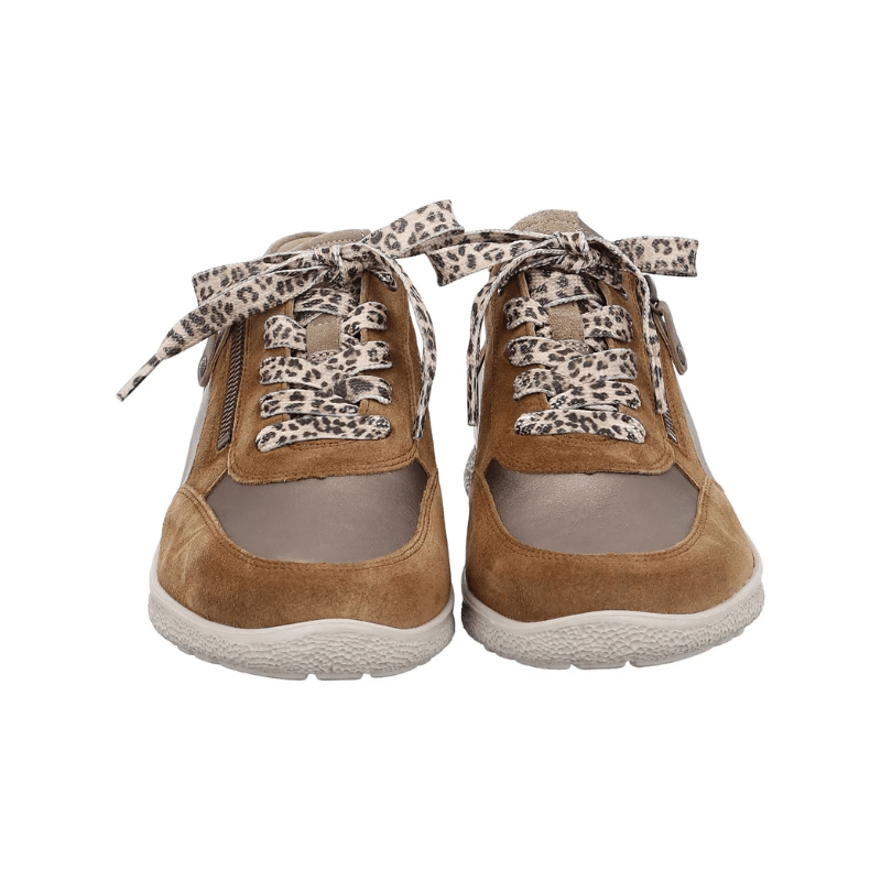 Sneaker féminine marron, chic et intemporelle avec une légère brillance de Hartjes. La chaussure est dotée de lacets à imprimé léopard tendance et une fermeture éclair sur le côté pour un enfilage facile.