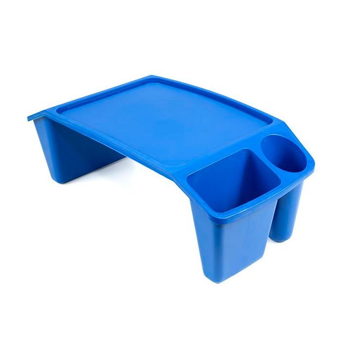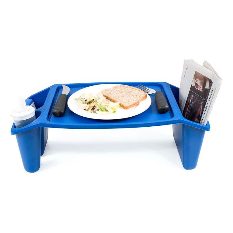 Plateau intelligent avec compartiments de rangement de chaque côté. Le plateau peut être utilisé aussi bien au lit que dans un fauteuil de repos. Il dispose de compartiments pratiques de chaque côté pour ranger par exemple des journaux, des serviettes et autres articles similaires. Le plateau est bleu, mesure 60 cm de largeur, et la surface de la table est de 35 x 28 cm.
