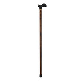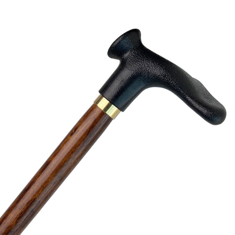 Élégante canne en bois avec poignée anatomique noire et bague décorative dorée.